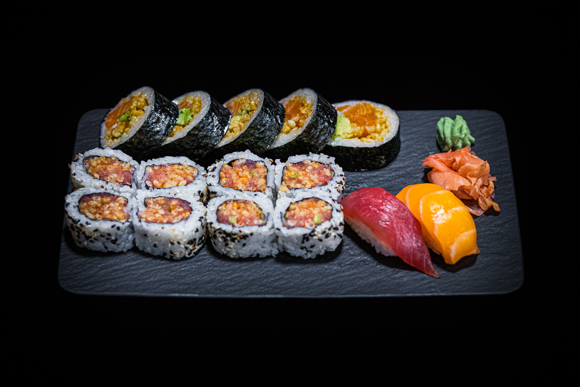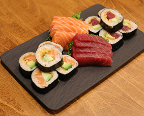 2 kamikaze salmon 2 kamikaze tuna 2 nigiri 4 sashimis salmon/tuna 4 hosomakis salmon/tuna 4 in-out spicy salmon/tuna