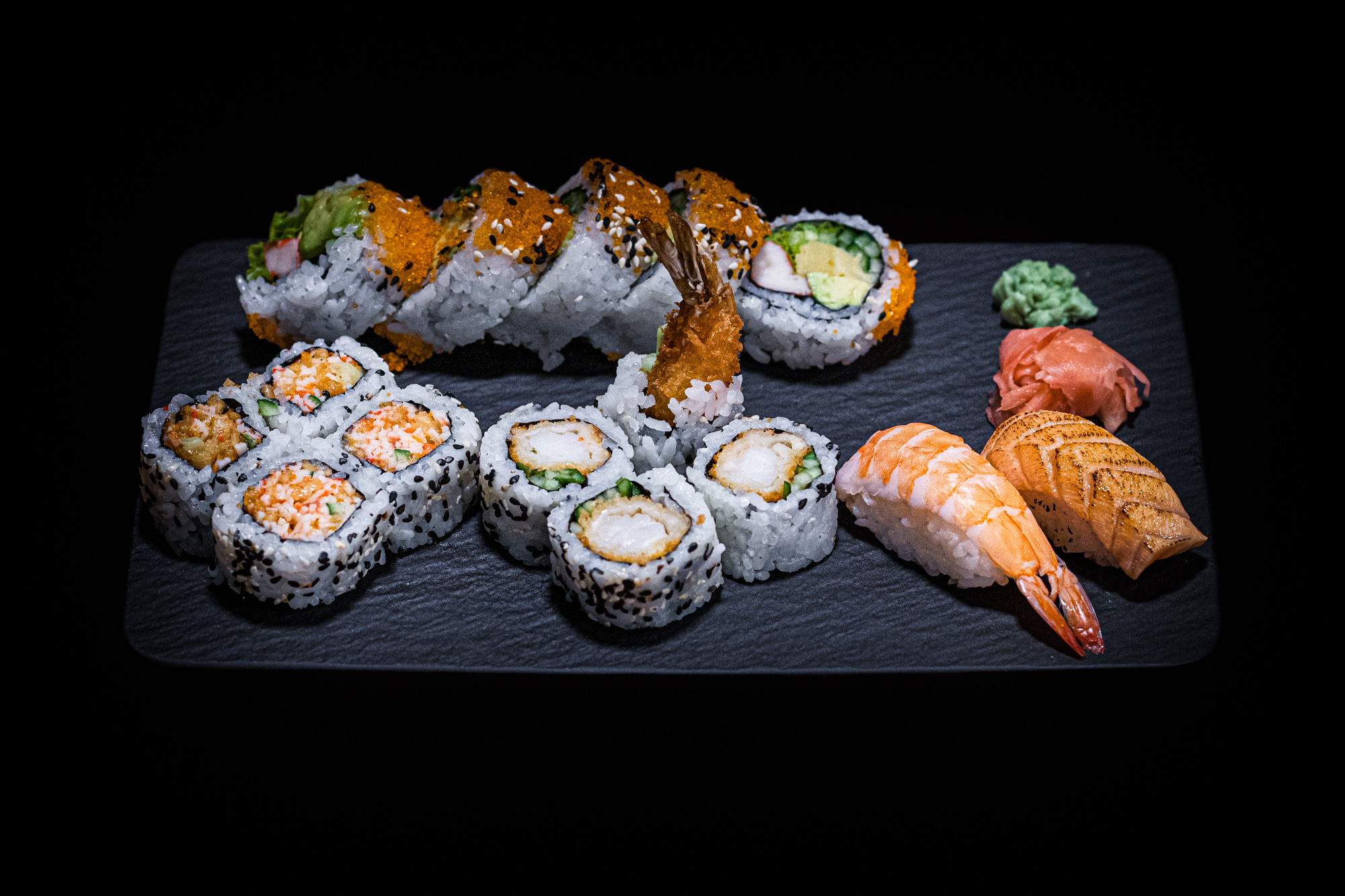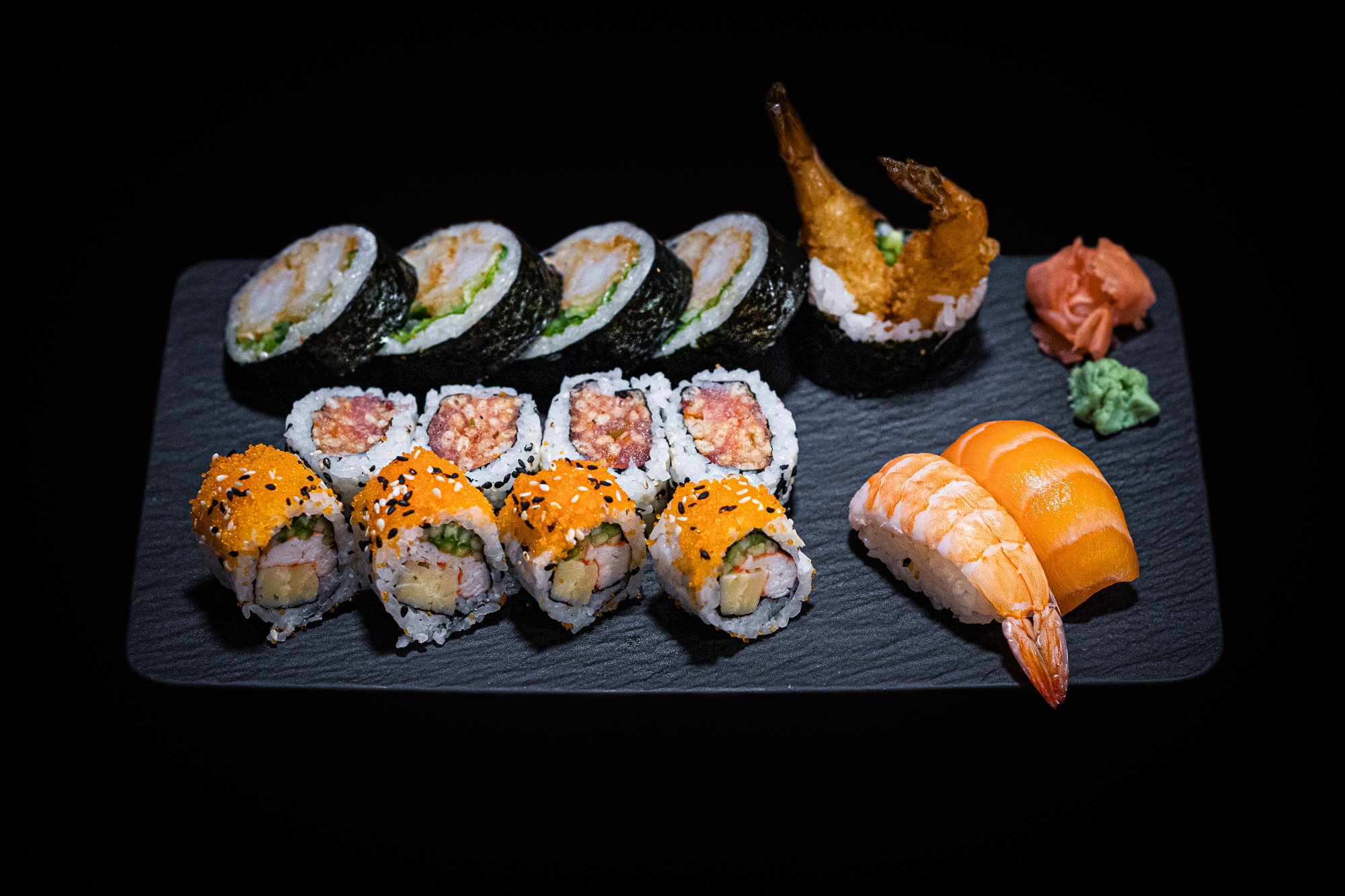 1 futomaki california 1 kamikaze salmon 4 hosomaki salmon 4 hosomaki cucumber 5 nigiris