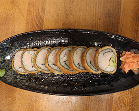 tempura roll with salmon, avocado, palingsaus en pikante mayonaise