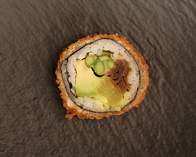 tempura roll with fried scampi, avocado, paling sauce and mayonaise