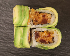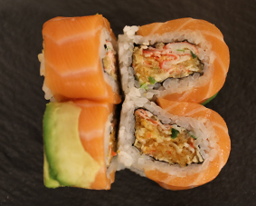 spicy salmon roll topped with salmon, avocado en mayonnaise