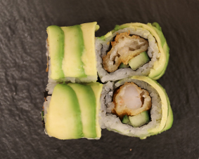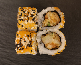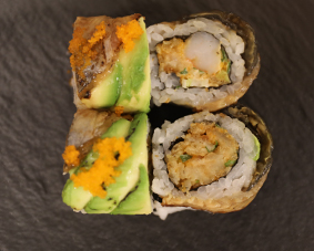 scampi tempura, cucumber, sweet soja sauce topped with tobiko en massago