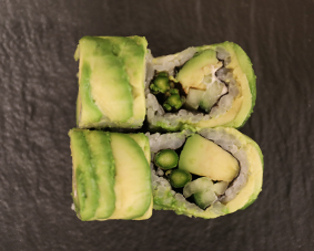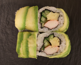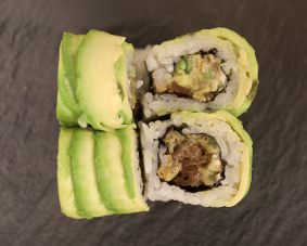 asparagus, avocado, cucumber, topped with avoc ado, creamcheese