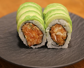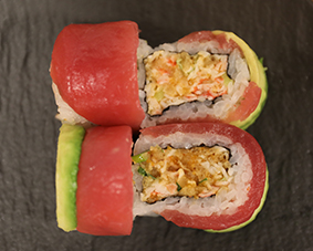 spicy kanikamasalade roll topped with salmon, avocado and mayonnaise