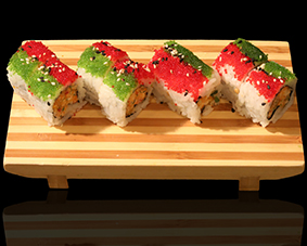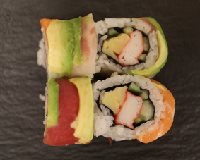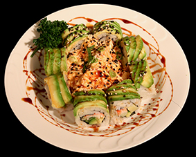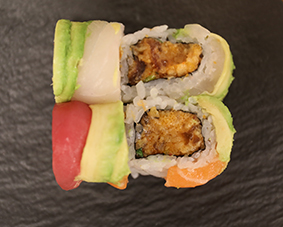 cooked salmon, seabass, kanikama, spicy mayonnaise and sweet sauce with a green rainbow roll